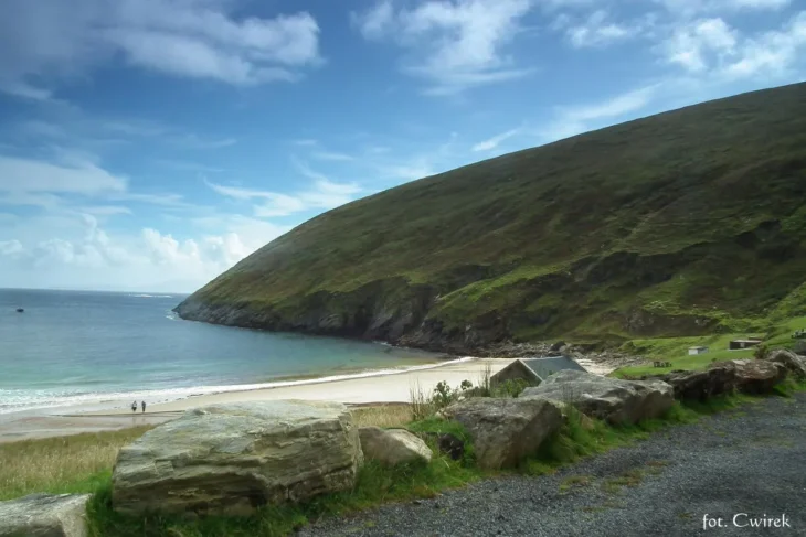 Croaghaun Cliffs czas było opuścić tak więc spokojnym tempem pomaszerowaliśmy w dół w kierunku Keem Beach. Dzionek zaczynał zbliżać się do końca choć oczywiście mieliśmy jeszcze parę godzin do zachodu słońca ale trzeba było myśleć nad miejscówką do spania, no i dobrze by było coś jeszcze na tej wyjątkowej wyspie zobaczyć. Nieśpiesznie opuściliśmy jedną z najpiękniejszych, irlandzkich plaż i pojechaliśmy w głąb Achill.
