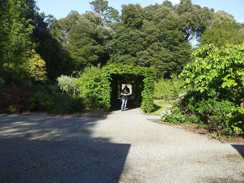 Ashford Castle jest duży, jednak to tylko niewielka część całego, liczącego 110 kilometrów kwadratowych terenu. Nie zapuszczaliśmy się w głąb wielkiego parku, nie chodziliśmy kilometrami ścieżek i alejek. Zajęłoby nam to z pewnością parę godzin, więc skupiliśmy się na terenie okołozamkowym. Podeszliśmy nad brzeg jeziora, lizneliśmy kawałeczek leśnych alejek ale przede wszystkim weszliśmy do zamkniętego, kamiennego ogrodu, w którym niegdyś rosły różnego rodzaju warzywa i owoce. Aby do niego wejść, trzeba przejść przez kilkumetrowy, lekko kręty ciemny tunel. Ogród robił wrażenie delikatnie zaniedbanego, być może pora roku nie ta? Chociaż końcówka maja chyba powinna sprzyjać pojawianiu się roślinek? Nie wiem. Budynki gospodarcze wydawały się być opuszczone, ogrodowe dróżki lekko zapuszczone, więc chyba lata świetności tego miejsca minęły. A szkoda, bo miejsce naprawdę urocze. Grzechem byłoby nie wspomnieć o fontannie tuż przed Zamkiem.