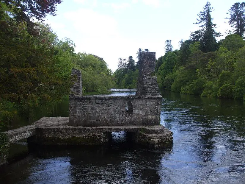 Monk’s Fishing House prawdopodobnie powstał w 15 lub 16 wieku. Mały kamienny domek stoi na kamiennej podstawie, a wokół i pod nim przepływa rzeka. Wchodzi się do wnętrza, bardzo surowego i na samym środku znajduje się pułapka na ryby. Była to wnęka w podłodze, do której rybak wkładał siatkę i ryby płynące razem z prądem rzeki wpadały do niej bez opamiętania. Prosto z wody lądowały w małym , kamiennym piecu, gdzie je podpiekano a następnie z chatki rybaka, specjalnie skonstruowaną liną, transportowano do kuchni. Będąc na rzece Cong, na mostku obok chatki rybaka i spoglądając w stronę ujścia rzeki do Lough Corrib można zaobserwować mury Ashford Castle. Wydawało nam się, że jest to rzut beretem ale aby dostać się na teren Zamku samochodem należy przejechać może z 2 kilometrowy odcinek. Pokręciliśmy się jeszcze troszeczkę po Cong Abbey i wróciliśmy do samochodu.