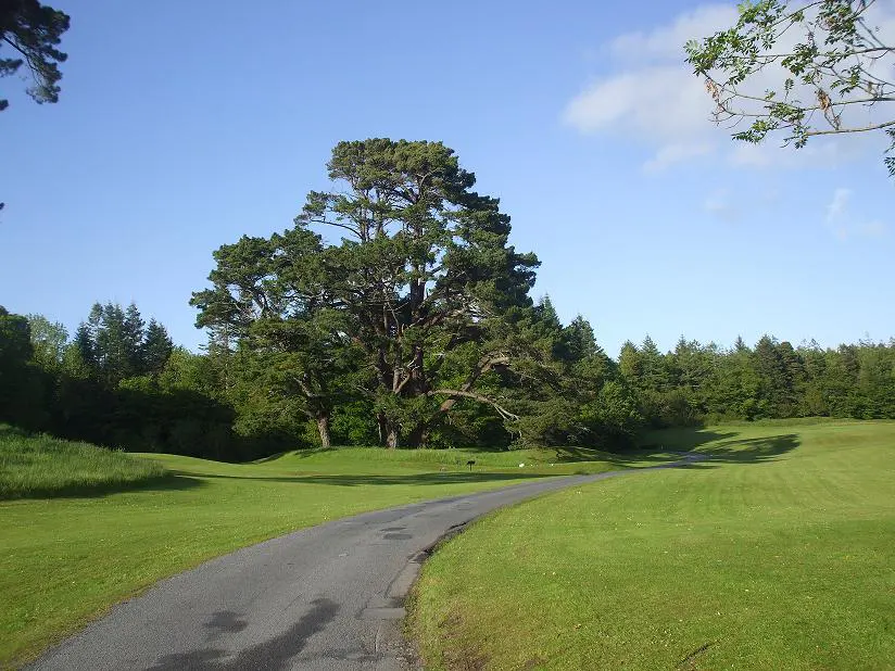 Fontanna bezustannie pluła wodą, woda wpadała do sporych rozmiarów okręgu, wokół był jasny żwir a dalej połacie równiutko przystrzyżonej trawy. W trawce gdzieniegdzie posadzone były klomby kolorowych kwiatów, które podziwiać można z ławeczek, licznie posianych wkoło. Na zakończenie naszej wizyty cofnęliśmy się do rozległych pól golfowych. Szliśmy drogą i łapaliśmy fragmenty ciekawych miejsc. Tu wielkie i monumentalne drzewa, tam mniejsze i równie okazałe krzaki. Trawa, jak to na polach golfowych, była przystryżona do granic możliwości, równiuteńka jak dywan, gęsta, przykuwająca swoim widokiem i kusząca aby jej dotknąć, aby po niej pochodzić. Przeszliśmy około kilometra i wróciliśmy do nieopodal zaparkowanego auta.