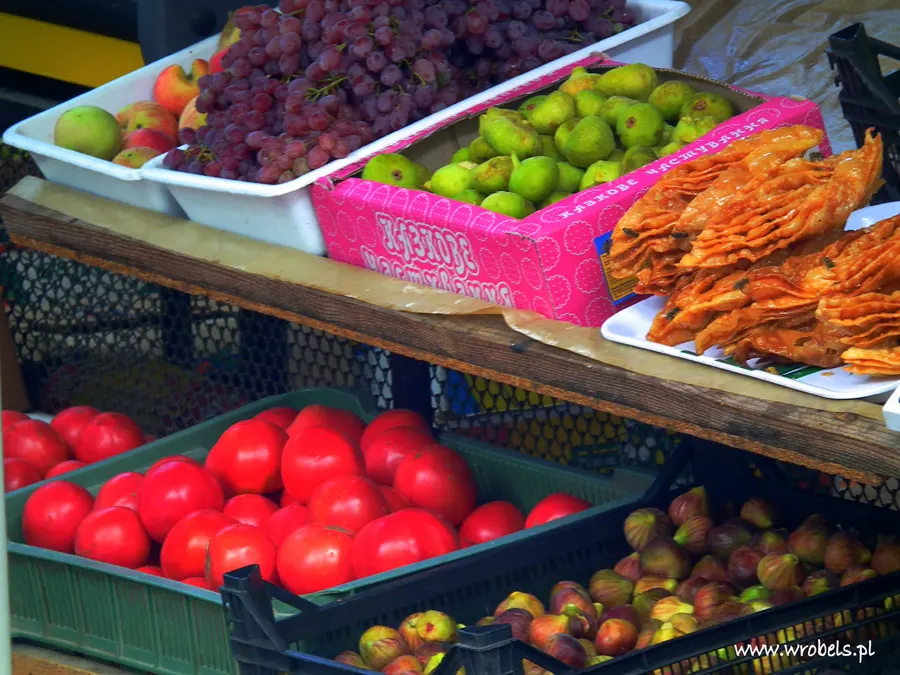 Sprzedawano tam głównie owoce, warzywa, drożdżóweczki i ciasta domowej roboty. Były też jajka, coś na kształt czeburieków tyle że chyba na zimno i orzechy. Miejsce niezwykle kolorowe i spokojne – ludzi zastaliśmy tam niewielu. Pomimo, że niedawno skończyliśmy konsumować nasze najważniejsze danie tej części wyprawy krymskiej, to i tak marzyliśmy o smakach tych pięknie wyglądających, soczystych owoców, które tak dumnie prezentowały się na targowych straganach… Najśmieszniejsze jest jednak to, że nic na tym targu nie kupiliśmy, dopiero parę metrów obok, w pobliskim sklepie zrobiliśmy zakupy na wieczór (woda, serki topione i 2 pomidory)… Po chwili znów byliśmy w wędrówce.