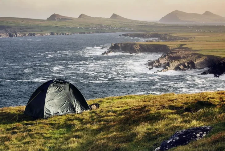 Kraina, w której udało nam się zameldować miała w sobie chyba wszystko, co w krajobrazie Zielonej Wyspy jest najbardziej charakterystyczne: wzburzone fale oceanu, uderzające z furią o postrzępione skały, widowiskową zatokę, w której usytuowana została równie atrakcyjna plaża, zielone pola trawy poprzecinane przez kamienne murki, owieczki pasące się na tych odżywczych pastwiskach, wysokie i strome urwiska. W oddali widać Sybil Head, tuż za nim The Three Sisters, czyli trzy bliźniacze wzgórza spoglądające w stronę oceanu, a najbliżej nas Clogher Bay ze wspomnianą plażą. Wysiedliśmy z auta tylko na moment, na zrobienie pamiątkowego zdjęcia, na króciutką przechadzkę po okolicy. Moment przerodził się w dłuższą chwilę aż w pewnym momencie zapadło postanowienie, że zostajemy i rozkładamy się z namiotem.