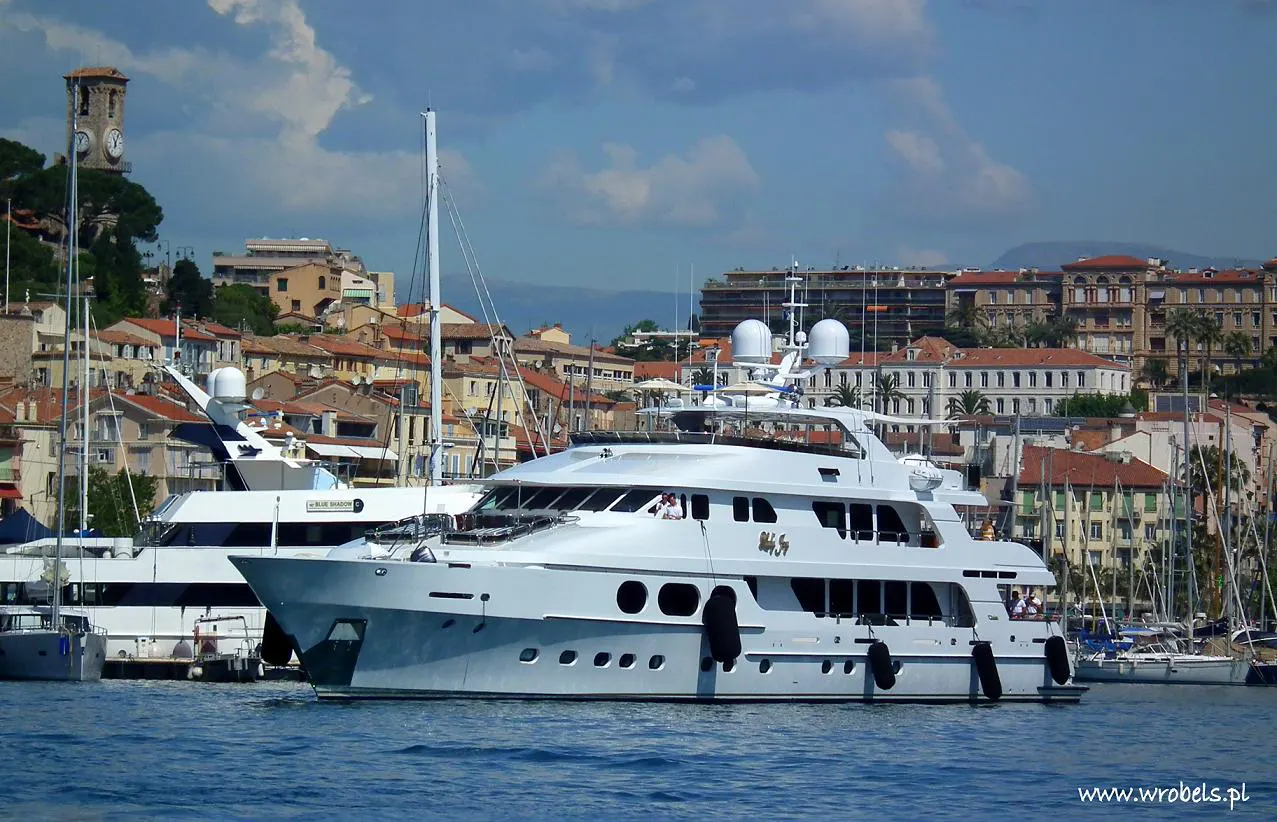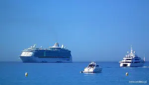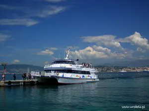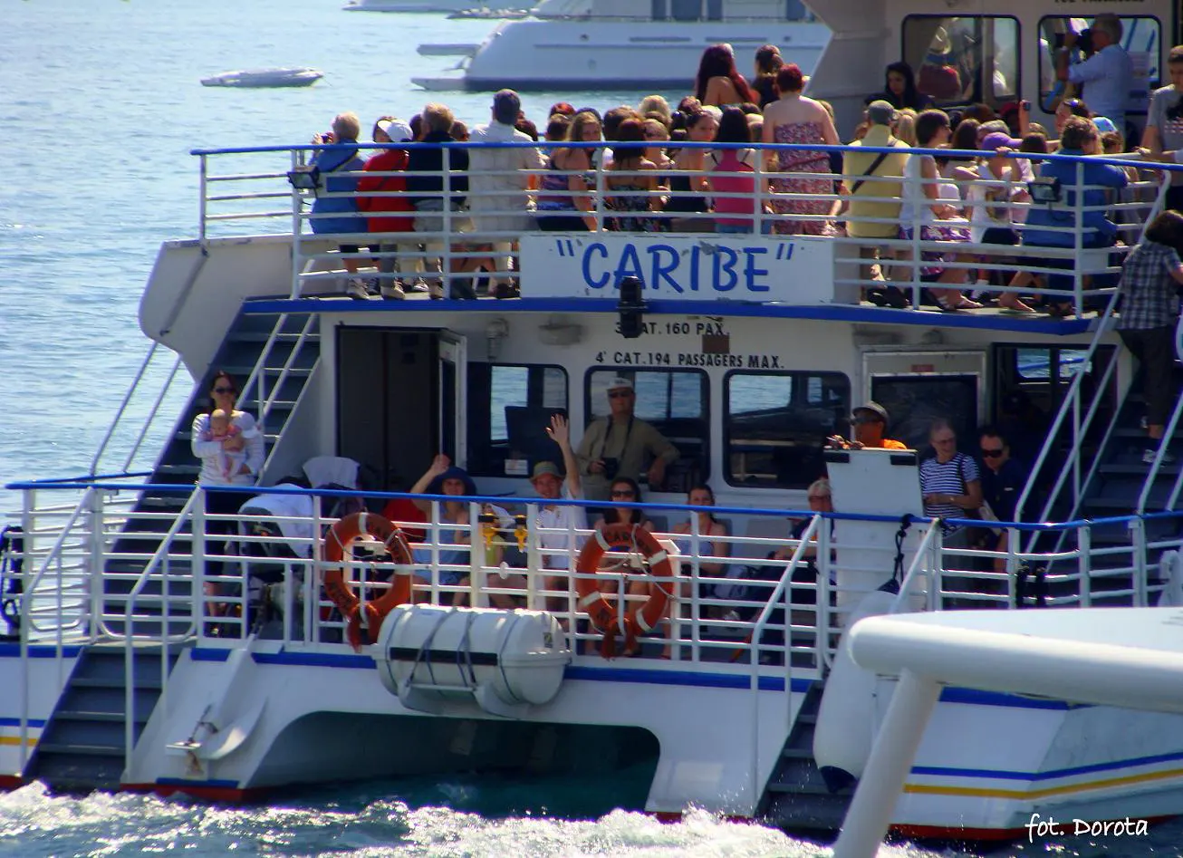 Prom typowo pasażerski, z dolnym i górnym pokładem, na dwóch płozach, mogący naraz zabrać coś pod 200 osób. Z portu wypłynęliśmy tyłem, później przez cały teren zatoczki portowej sunęliśmy bardzo wolno, dopiero po jej opuszczeniu kapitan się rozpędził i gnał ile mu fabryka dała. W marinie zacumowane były kutry jachty z wyższej półki, co jeden to większy i piękniejszy. Nad nami co kilka minut kursował mały helikopter (ląd-wyspa, na którą płynęliśmy) a trochę dalej, na wodach głębszych stał sobie ogromny statek pasażerski. Spoglądaliśmy na rozsypane po morzu jachty, na oddalający się stały ląd, na ośnieżone szczyty Alp majaczące gdzieś daleko na horyzoncie, cieszyliśmy się podmuchami wiatru i wlepialiśmy ślepia we wzburzoną, białą toń, tworzącą się tuż za silnikiem. Przejażdżka trwała nie więcej niż 2 kwadranse.