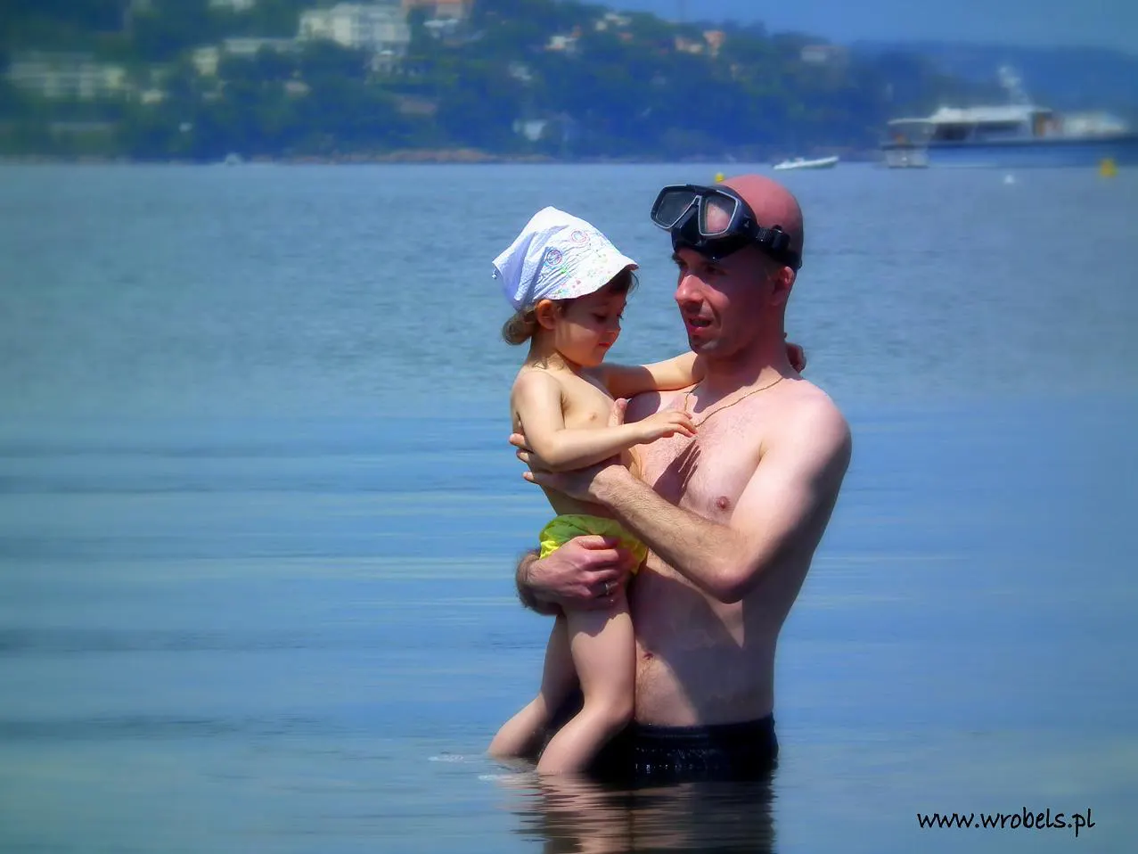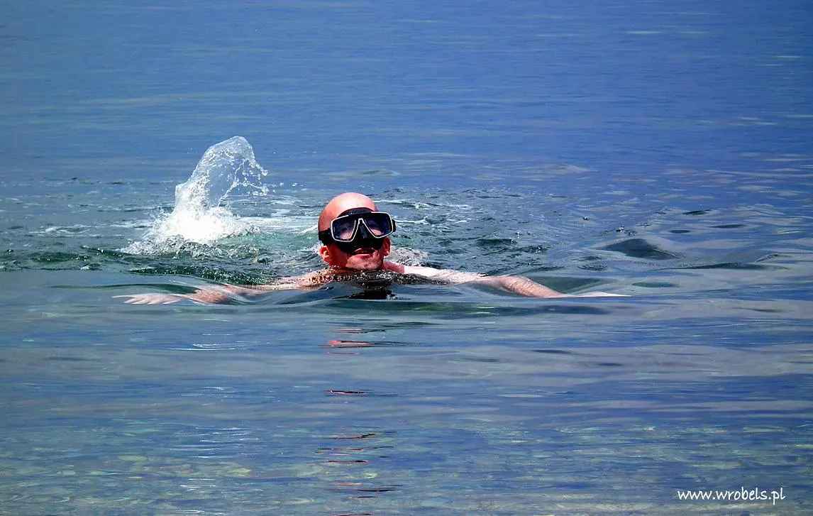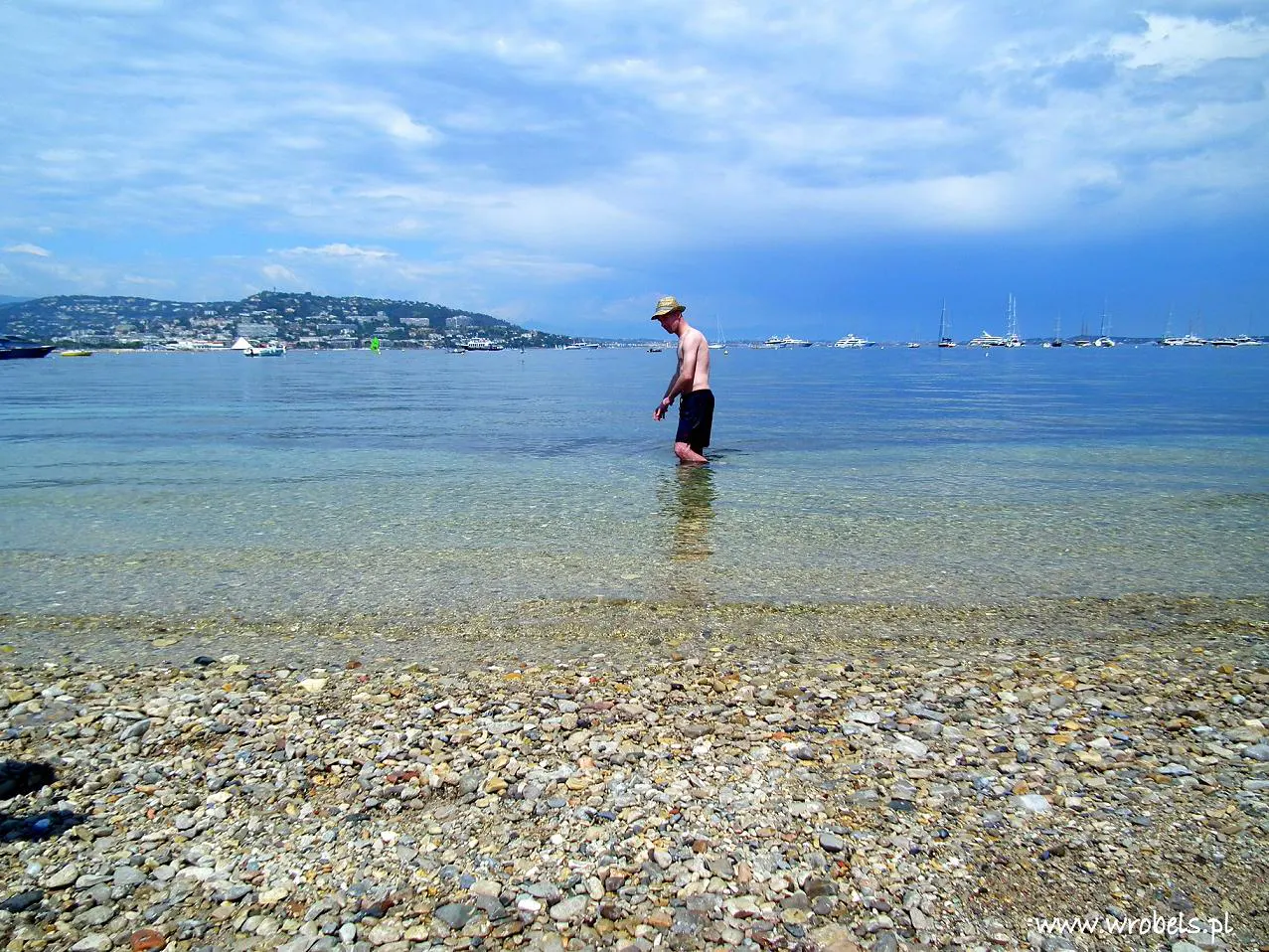 Po około godzinie, a była już niemal 3 po południu, rozłożyliśmy się na plaży w miejscu, gdzie kończyła się drewniana kładka spacerowa. Po niemal bezustannym marszu należała się chwila odpoczynku. Morze przy pierwszym zetknięciu dość zimnawe, wiadomo trzeba albo na dzikolca, albo stopniowo – mnie zajęło spory fragment czasu zanim całkowicie się zanurzyłem, ale gdy już się to w końcu stało… W ruch poszła moja podwodna maska, nogi przebierały równomiernie, oddech wstrzymany i cały podwodny świat miałem tylko dla siebie. Takie zanurzenia nie trwały więcej niż kilkanaście, kilkadziesiąt (?) sekund ale i tak udało się po obcować z morskimi roślinkami, pozbierać parę kamyków z dna czy spotkać bardzo płochliwe, kolorowe rybki. Oczywiście woda błysk! Czyściutka, przeźroczysta, niezwykle przejrzysta – aż chciałoby się mieć płetwy i butlę do oddychania. Jeśli tak proste nurkowanie może sprawić tyle przyjemności, to co dopiero musi być w rafie koralowej i z całym profesjonalnym sprzętem? 🙂 Trochę popływałem, trochę poleżeliśmy na piasku, cały czas obserwując morze, Cannes w oddali, wyspę za plecami i fort z boku. Z Wyspy Św. Małgorzaty w stronę Cannes płynęły małe łódki żaglowe, z dziećmi w wieku szkolnym na pokładzie. Płynął z nimi instruktor, każdy w ochronnym kapoku, jedna część z żaglami błękitnymi, inna w kolorze czerwieni. Wiedzieliśmy już wcześniej, że tego typu szkoła pod żaglami jest ale w sumie nie spodziewaliśmy się, że tak młodzi żeglarze pokonują aż tak daleki dystans? Szacunek dla nich, bo sam chyba miałbym stracha 🙂
