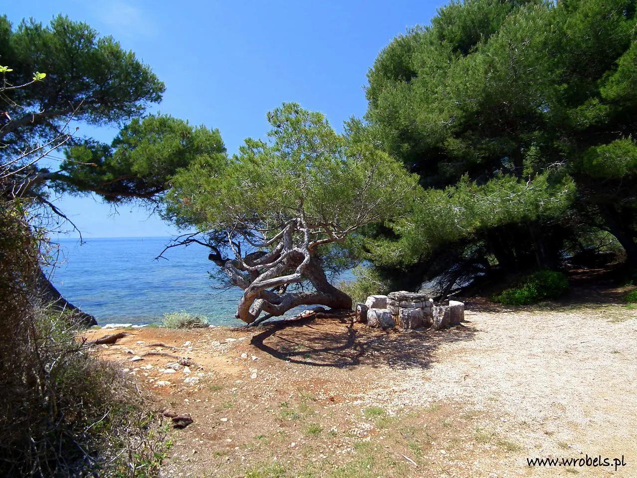 Od tej strony wyspy, przez całą jej długość wzdłuż wybrzeża idzie się praktycznie cały czas pod osłoną drzew. Co jakiś czas oczywiście wychodziliśmy na odsłonięte fragmenty drogi ale zielone było na wyciągnięcie ręki. Właśnie w jednym z takich zielonych fragmencików postanowiliśmy przycupnąć i coś przekąsić. W rejonie wyspy, w którym się znaleźliśmy, były świetne miejsca przystosowane do tego typu kulinarnych wypoczynków. Kamienne stoły i ławy zrobiono ze skał – podobierano odpowiedniej wielkości i o odpowiednim kształcie głazy i poustawiano we właściwy sposób. Spędziliśmy tam chwilę, zjedliśmy co było do zjedzenia i spokojnie powędrowaliśmy dalej. Wspominałem na początku o kapaniu, że być może uda się to tutaj. Niestety – łatwego dojścia do wody z tej strony nie było, poszarpany i kamienisty brzeg nie ułatwiał sprawy i o orzeźwiającej kąpieli musiałem zapomnieć. Kąpali się za to inni ale nie z brzegu, a z jachtów.