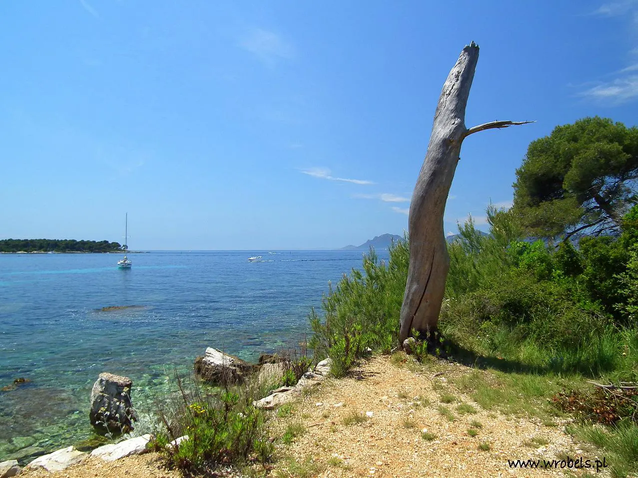 Stateczek wyładował się w mgnieniu oka, wszyscy ludzie gdzieś się rozproszyli, grupka czekająca na powrót do Cannes zajęła nasze niedawne miejsca a my ciekawi wyspy postanawiamy się z nią bliżej zapoznać. Odpuściliśmy na razie Fort Royal (zostawiając go sobie na koniec), który stał się pierwszym celem wycieczkowej chmary i powędrowaliśmy w prawo, mając w planie obejście wyspy dookoła. Pierwsza myśl kłębiąca się w mojej głowie kazała jak najprędzej wyszukać odpowiednie miejsce na wejście do wody. Było ciepło, lazurek w wodzie prawie że wołał aby wskoczyć, więc nic dziwnego, że zamarzyła mi się ochłoda. Jak się później okazało, jedynym sensownym miejscem kąpielowym była właśnie plaża na północno-zachodnim brzegu wyspy (czyli tam gdzie się znajdowaliśmy) – nie wiedząc tego wcześniej poszliśmy na drugą stronę z myślą, że może uda się zlokalizować bardziej odludne miejsce.