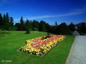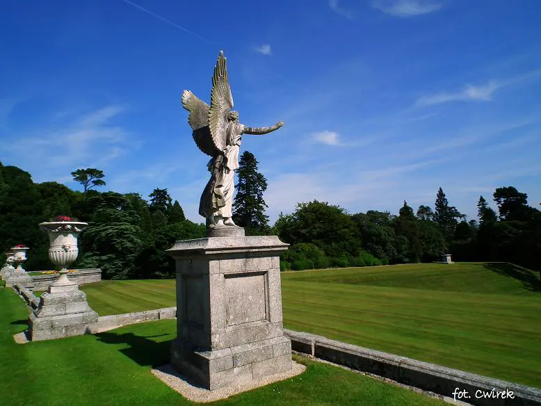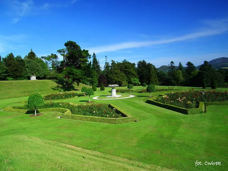 Trafiliśmy tam tuż po wizycie w Powerscourt Waterfall. Oba miejsca dzieli od siebie zaledwie 6 kilometrów. Ażeby pojechać do tej pięknej posiadłości, należy zjechać z drogi R760, przejechać przez bramę i podjechać może z 2 kilometry. Rzuca się w oczy otwarta przestrzeń, jest mnóstwo drzew i króciutko przystrzyżonych łąk. Na miejsce dojechaliśmy po paru minutach i zakotwiczyliśmy na wielkim parkingu, który przyjął tego słonecznego dnia mnóstwo samochodów. Uświadomiliśmy sobie wówczas, że zwiedzających będzie z całą pewnością nie mniej niż paręnaście chwil wcześniej przy wodospadzie. I tak też w rzeczywistości było…