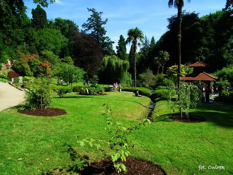 Będąc już na terenie ogrodów, a konkretniej stojąc na żwirowej alejce tuż przed głównym domem Powerscourt w oczy rzuciły nam się rozległe zielone tarasy, piękne i drobiazgowo wykute rzeźby, idealnie równo skoszona trawa, w oddali drzewa, krzewy, troszkę bliżej kolorowe klomby różnego rodzaju kwiatów. W dalszej perspektywie, dumnie na horyzoncie stoi sobie Wielka Głowa Cukru/Great Sugar Loaf, czyli 500 metrowa góra, będąca częścią Wicklow Mountains. Spoglądając w dół pięknych, wielkich schodów; z najwyższego, piątego tarasu, widać Jeziorko Trytona/Triton Lake oraz tryskającą z niego na 30 metrów w górę fontannę. Z mapką w dłoniach, którą dostaliśmy wraz z biletem, podążyliśmy w kierunku pierwszej atrakcji. Minęliśmy parę rzeźb, pokonaliśmy kilka schodków i znaleźliśmy się w otoczeniu drzew i krzew, które stworzyły swego rodzaju roślinny tunel. Na jego końcu zobaczyliśmy kamienna wieżę. Tower Volley/Pepper Pot Tower wzorowana była na …pieprzniczce ze stołu 8 wicehrabiego Powerscourt i została zbudowana w 1911 roku dla upamiętnienia wizyty księcia Walii. Nie jest ona jakoś przesadnie wysoka, ma może z 16 metrów ale położona wśród drzew prezentuje się bardzo ładnie. Wokół niej porozstawiane są małe armaty a do jej środka dostać się można poprzez niewielkie drzwi usytuowane troszeczkę poniżej gruntu. Spiralne schody prowadzą na górę, z której rozciąga się widok z jednej strony na dom Powerscourt, z drugiej na Wielką Głowę Cukru a dookoła na wysokie, rosnące wszędzie drzewa. Po chwili wędrowaliśmy na dół, zostawiając za sobą wieżę i kierując się w stronę Japońskich Ogrodów. Czuliśmy się wyśmienicie mając dookoła mnóstwo zieleni, zerkając na króciutką trawę, na krzaki większe i mniejsze porozstawiane tu i ówdzie. W pewnej chwili dostrzegliśmy znak: Japanese Gardens, który kierował nas w dół, do niewielkiej dolinki poprzeszywanej małymi drewnianymi mostkami, kamiennymi latarniami i wąskimi ścieżkami.