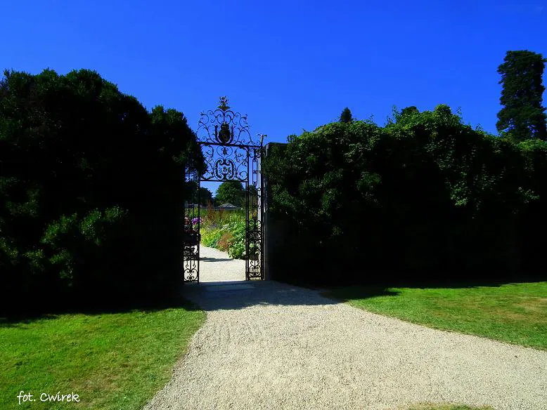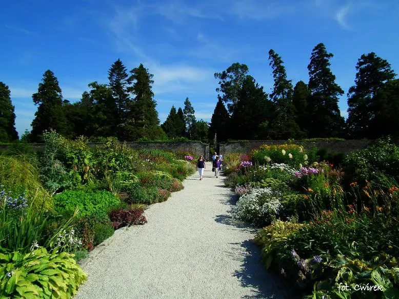 Jedna z końcowych stacji w tym zjawiskowym miejscu to Walled Garden/Kamienny Ogród. Wchodzi się do niego przez metalową, pięknie zdobioną bramę. Przypominało mi to bardzo podobne wejście, do równie ładnych, chociaż ciut innych kamiennych ogrodów, znajdujących się w Lough Rynn House & Garden. Tutaj jest tylko jeden poziom, jest główna alejka, po której obu stronach rosną sobie kwiatki i inne różnego rodzaju krzewy. Sprawiało to wrażenie ,,wolnej amerykanki”, czyli wszystko bez ładu i składu. Tak jakby posadzono roślinki i powiedziano im: róbta se co chceta! I roślinność posłuchała, bujnie rozrastając się po kamiennym ogrodzie. Po paru chwilkach minęliśmy małą, kolejną już tego dnia fontannę, tym razem Syrenki i opuściliśmy pierwszą część Walled Garden. Część druga zdawała się być bardziej poukładaną. Nie było takiego szalonego przepychu i dzikości, wszystko miało swoje miejsce, kwiaty rosły sobie w wyznaczonych do tego klombach, drzewa zostały starannie i równo przystrzyżone a trawa przypominała tę ze stadionów piłkarskich. W tej scenerii zrobiliśmy sobie krótki postój, usadowiliśmy się starannie na jednej z ławeczek i pochłonęliśmy to co tam mieliśmy do jedzenia. Tuż obok naszej ławki, parę metrów od nas widniała Bamberg Gate, czyli solidna i bogato zdobiona brama z 1770 roku, którą sprowadzono z Katedry w Bamberg, w Bawarii.