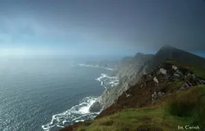 Muszę przyznać, że chyba najbardziej widowiskowa atrakcja na Achill Island robi wrażenie! Wielkie, na prawdę olbrzymie urwiska, które trudno było objąć wzrokiem dumnie wznosiły się z głębin oceanu na ponad 650 metrów w stronę nieba. Mieliśmy szczęście gdyż parę minut po naszym przybyciu nad klifami zaczęły się gromadzić chmury co troszkę zepsuło obserwowanie. Warto było delikatnie się zmęczyć wchodząc tam, zresztą był to nasz taki pierwszy trening przed dalszym podróżowaniem. Było warto przede wszystkim dla tych zapierających dech w piersiach krajobrazów, dla tych oceanicznych fal szturmujących skalisty ląd, było warto za ten przyrodniczy całokształt, który napotkaliśmy na swojej drodze. Te klify, w porównaniu ze słynniejszymi Cliffs of Moher czy Slieve League są najbardziej dzikie i niedostępne, nie można do nich dojechać samochodem, trzeba je zdobyć, trzeba zostawić trochę potu i sił ale zapewniam, że warto, na prawdę warto… Croaghaun Cliffs zaobserwowane raz, pozostają w pamięci przypuszczam, że do końca życia. Obcowanie z naturą w tak uroczych sceneriach wydaje się być esencją podróżowania, takie rzeczy chciałoby się oglądać jak najczęściej, takie krajobrazy powodują, że chce się wychodzić z domu i zwiedzać świat.