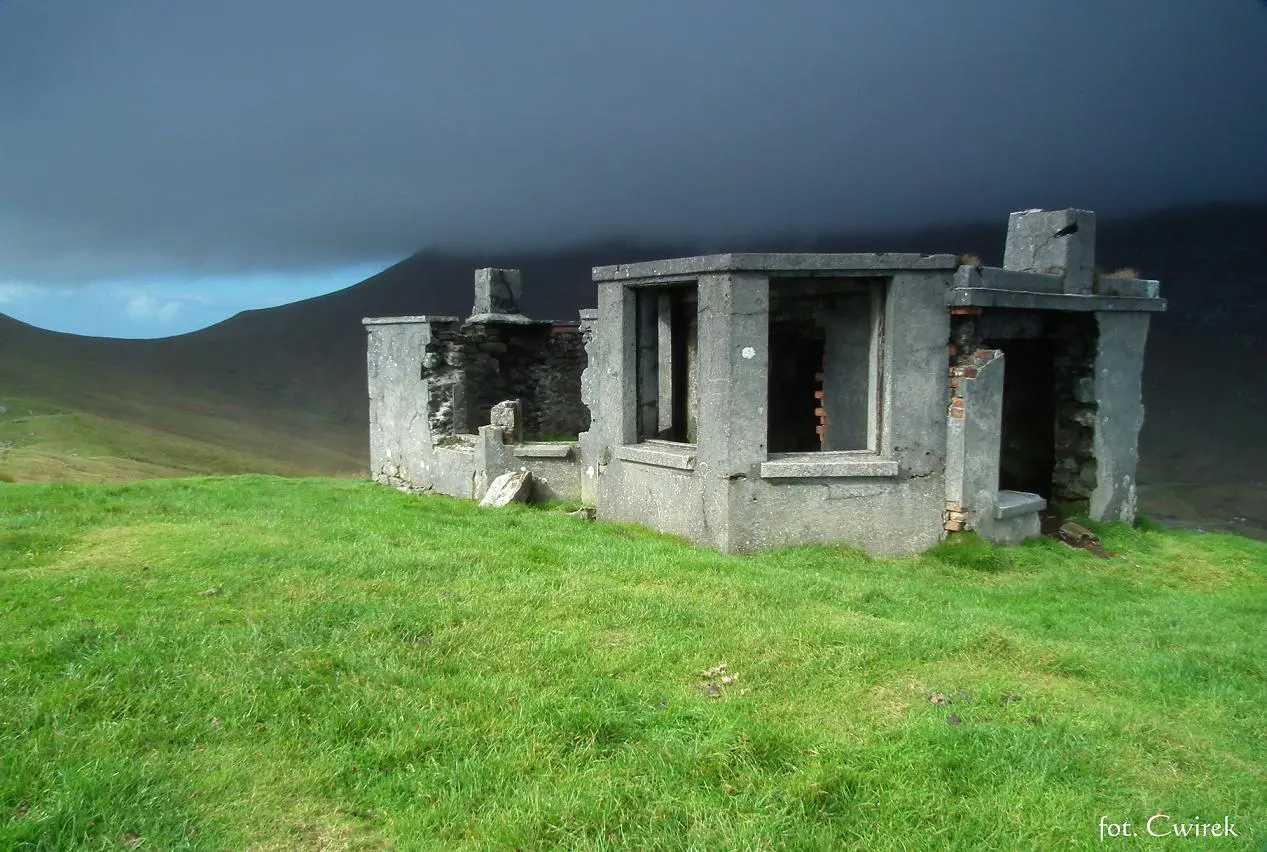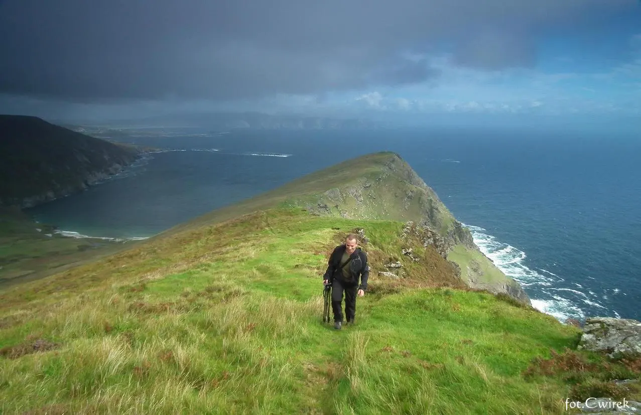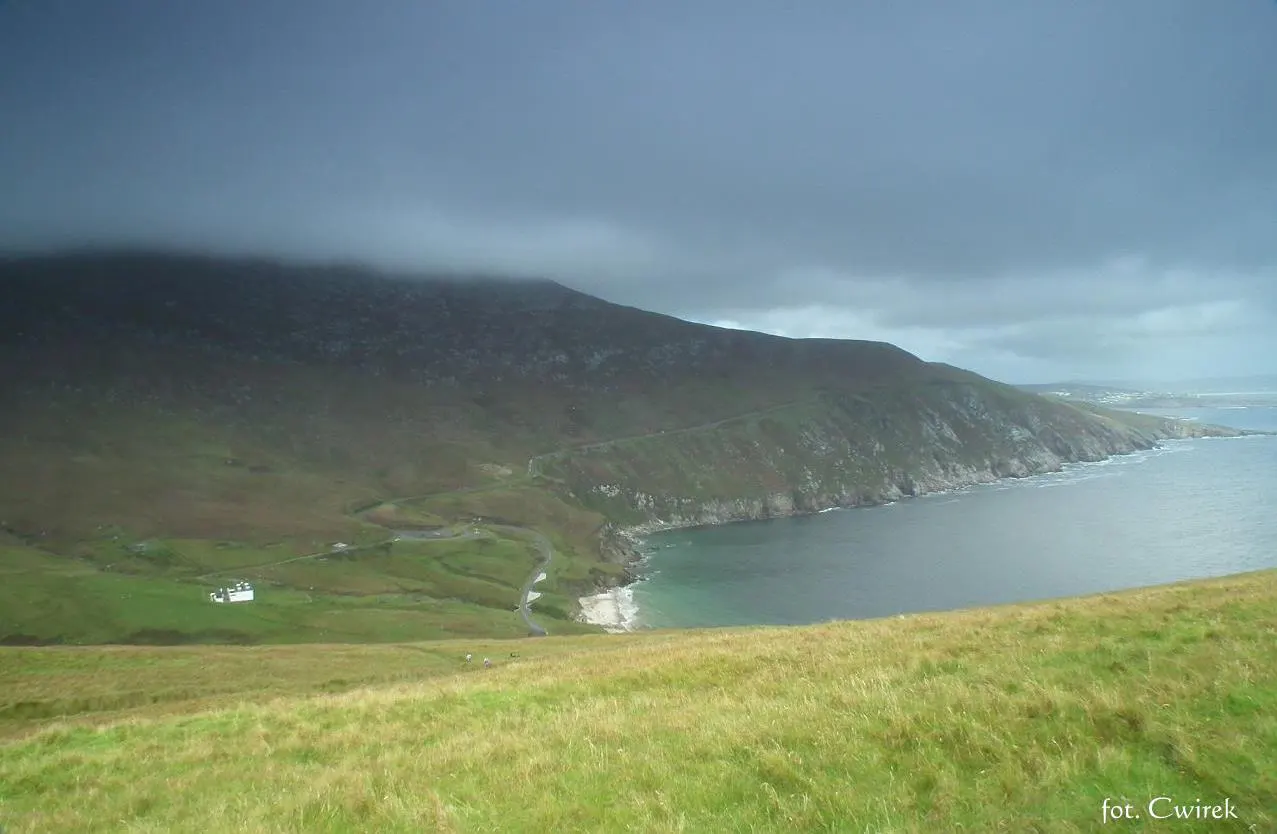 Popołudnie stawało się coraz późniejsze więc i czas najwyższy na wędrówkę w górę. Założyliśmy odpowiednie obuwie i zaczęliśmy się wspinać. Podejście nie było bardzo trudne, troszeczkę strome ale nie na tyle aby sprawiać kłopoty. Mieliśmy dwie opcje do wyboru, albo powędrujemy odcinkiem bardziej płaskim ale dłuższym albo dostaniemy się na górę szybciej lecz czekać nas będzie wspomniana wspinaczka. Postanowiliśmy się zmęczyć i szturmować górkę. Po około 30 minutach staliśmy na szczycie i napawaliśmy się uroczymi widokami. Keem Bay z góry wyglądała zupełnie inaczej, z jednej strony spoglądaliśmy na nieskończony bezmiar oceanu, z innej widać było wielką plażę w Keel, odwróciwszy się w bok patrzyliśmy na przykrytą chmurami inną górę ale najbardziej rzucały się ogromne, ponad 600 metrowe klify… Tam gdzie my byliśmy wznosiły się ruiny jakiejś opuszczonej chatki, nie była ona nie wiadomo jak stara i wyglądało na to, że kiedyś pełniła funkcję latarni morskiej. Zbudowana akurat w takim miejscu musiała spełniać tę funkcję. Zanim poszliśmy nad kilkusetmetrowe urwiska pogawędziliśmy momencik z pewnym Belgiem, który przybył do Irlandii wraz z synem na tygodniowy urlop i tak jak my postanowił zobaczyć na własne oczy te wszystkie wspaniałe miejsca znajdujące się na Achill. Opowiedziałem mu pokrótce jak się tutaj żyje i powędrowaliśmy dalej.