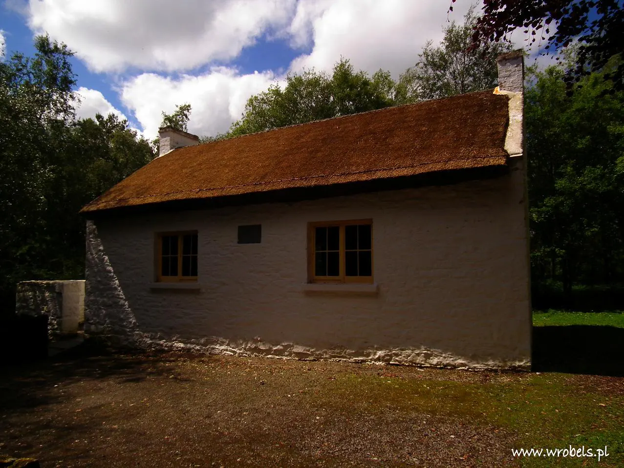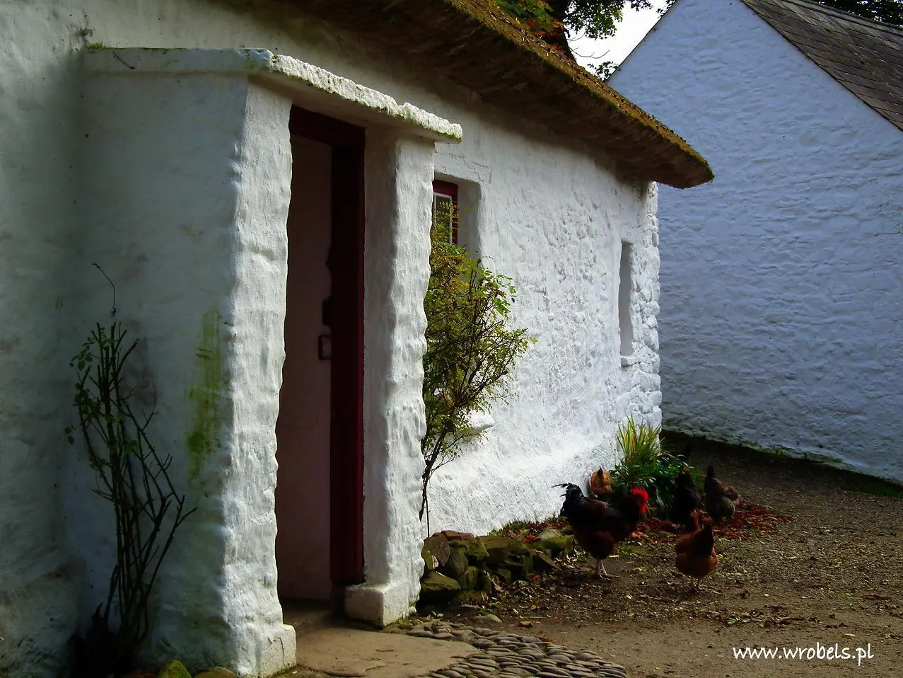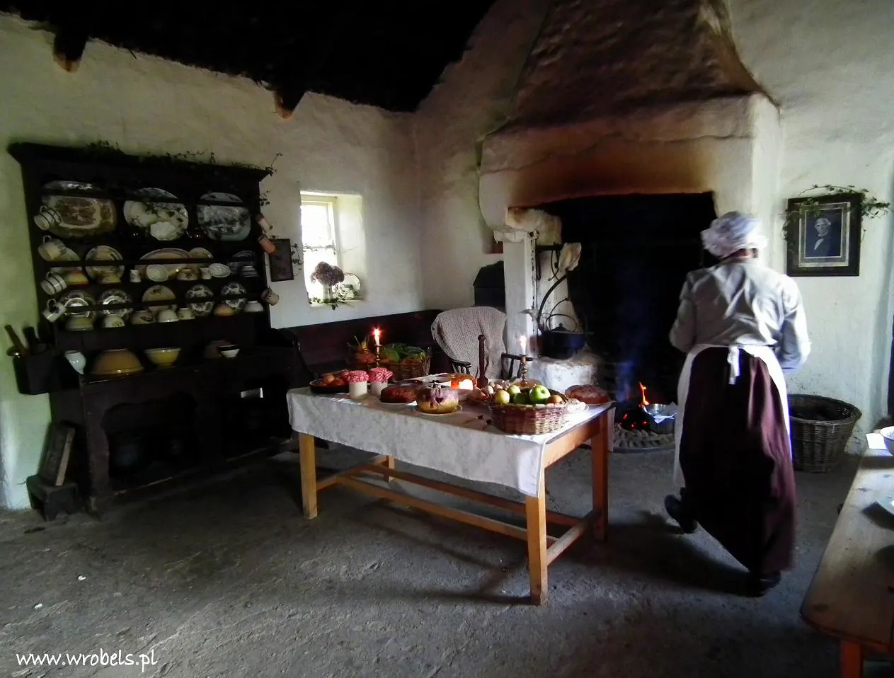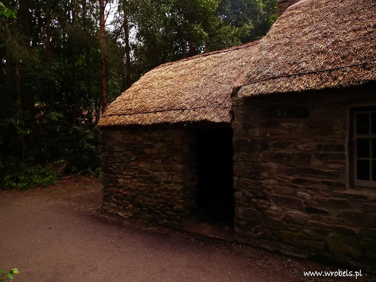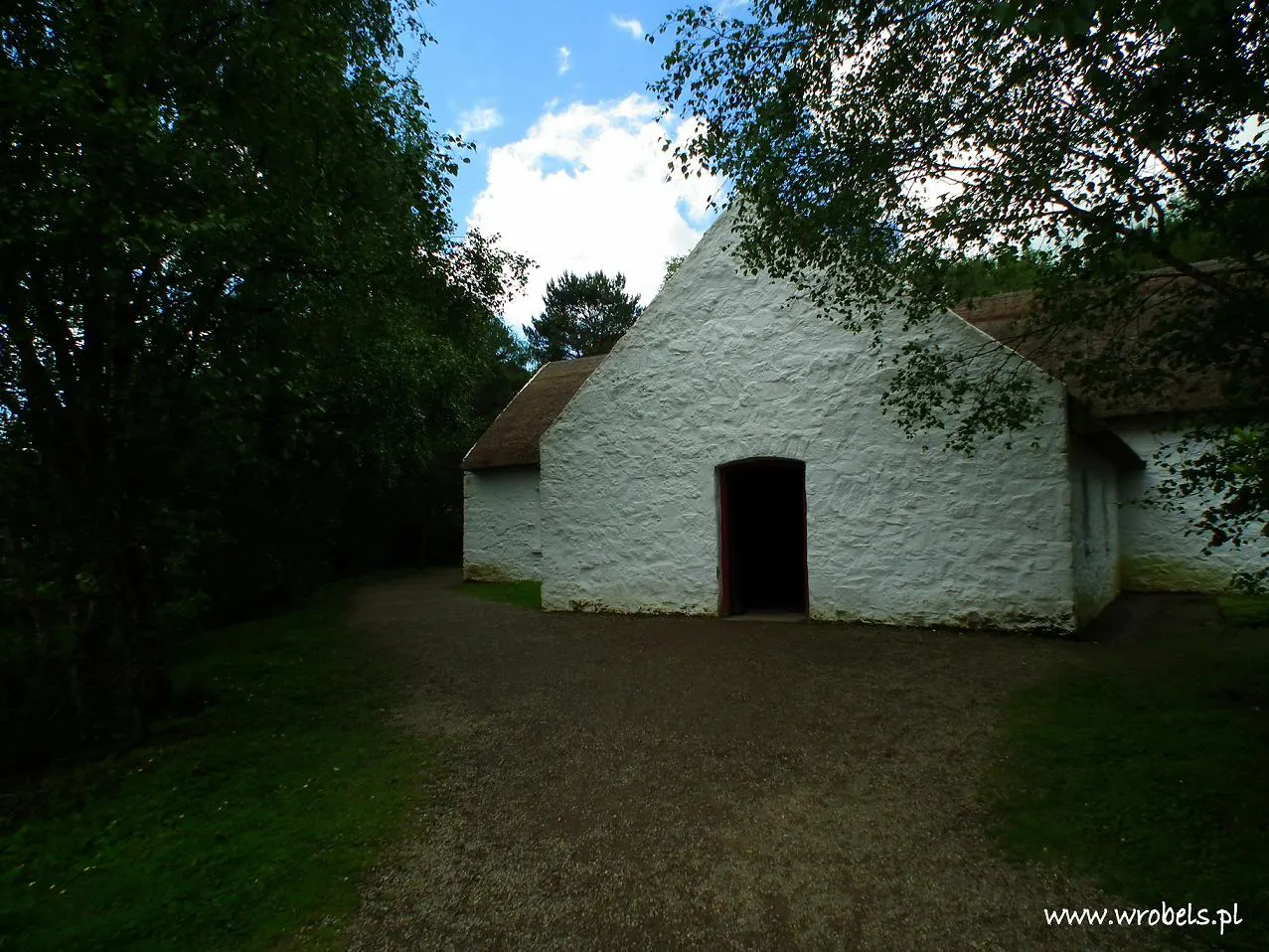 My zrobiliśmy to troszkę inaczej i od razu udaliśmy się na dwór. Niby z mapką – a trzeba przyznać, że wykonana była ona bardzo starannie i kolorowo, tak że szło się wraz z nią fajnie i łatwiej – ale i tak każdą pozycję odkrywaliśmy ze swoistym podziwem, wszystkie budynki nas zaskakiwały. Pierwszy pojawił się stosunkowo szybko, była to jednoizbowa chata, która została przeniesiona z Altahoney, małego miasteczka znajdującego się w pobliskich Górach Sperrin. Tego typu mieszkania zajmowali bezrolni biedacy, a działo się to długo przed nastaniem Wielkiego Głodu. Domek pochodził z końcówki 18 wieku i najpewniej mieszkała w nim 12 osobowa rodzina. Centralnym punktem był spory kominek, obok niego, we wnęce w ścianie było łóżko. Dopiero w późniejszym okresie zostały wstawione drzwi i okno, wcześniej wejście do domu zastawiano skórami zwierzęcymi bądź krzakami. Zwabieni dymem wydobywającym się z komina weszliśmy do środka. Ku naszemu zdziwieniu siedziała tam kobieta, która w wielkim kotle gotowała zupę. Nie przerywając opowiedziała nam historię tego miejsca, jak się w domku żyło i co jadało – wiedzieliśmy dobrze, że zaczyna się ciekawa przygoda, zauważyć trzeba, że ów kobiecina miała na sobie szaty z tamtego, odległego i jakże burzliwego okresu. Przenieśliśmy się w przeszłość. Fajnie. 🙂