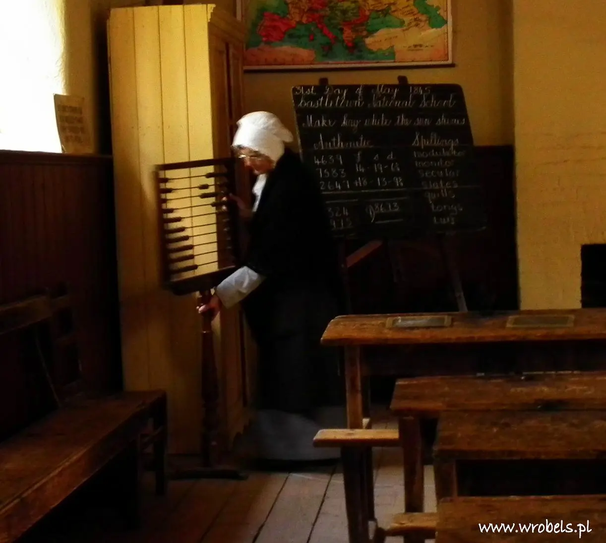 W każdym miasteczku, dużym czy małym, nie może zabraknąć szkoły. UAFP również takową posiada, powstała ona w 1845 roku w Castletown (mówi się, że na miejscu starej szkoły z 1790 roku), została rozebrana i powtórnie wzniesiona już na terenie Parku. Nie jest wielka, prawdę mówiąc jest malutka, bo składa się zaledwie z jednego pomieszczenia. Cały budynek mierzył 10,4m na 6,1m, uczyły się w nim dzieci ze wszystkich wyznań a średnia frekwencja oscylowała w granicach 70 uczniów. Dzieci uczyły się czytać, pisać i wykonywać proste działania arytmetyczne. Klasę zastaliśmy pustą, tylko nauczycielka krzątała się pod tablicą, jakby czekając na uczniów, którzy lada moment powrócą z przerwy. Z przodu, po środku stał kominek, po obu jego stronach, na ścianach widniały mapy, w roku tablica i liczydło a na środku sali rzędy drewnianych ławek oraz stolików.