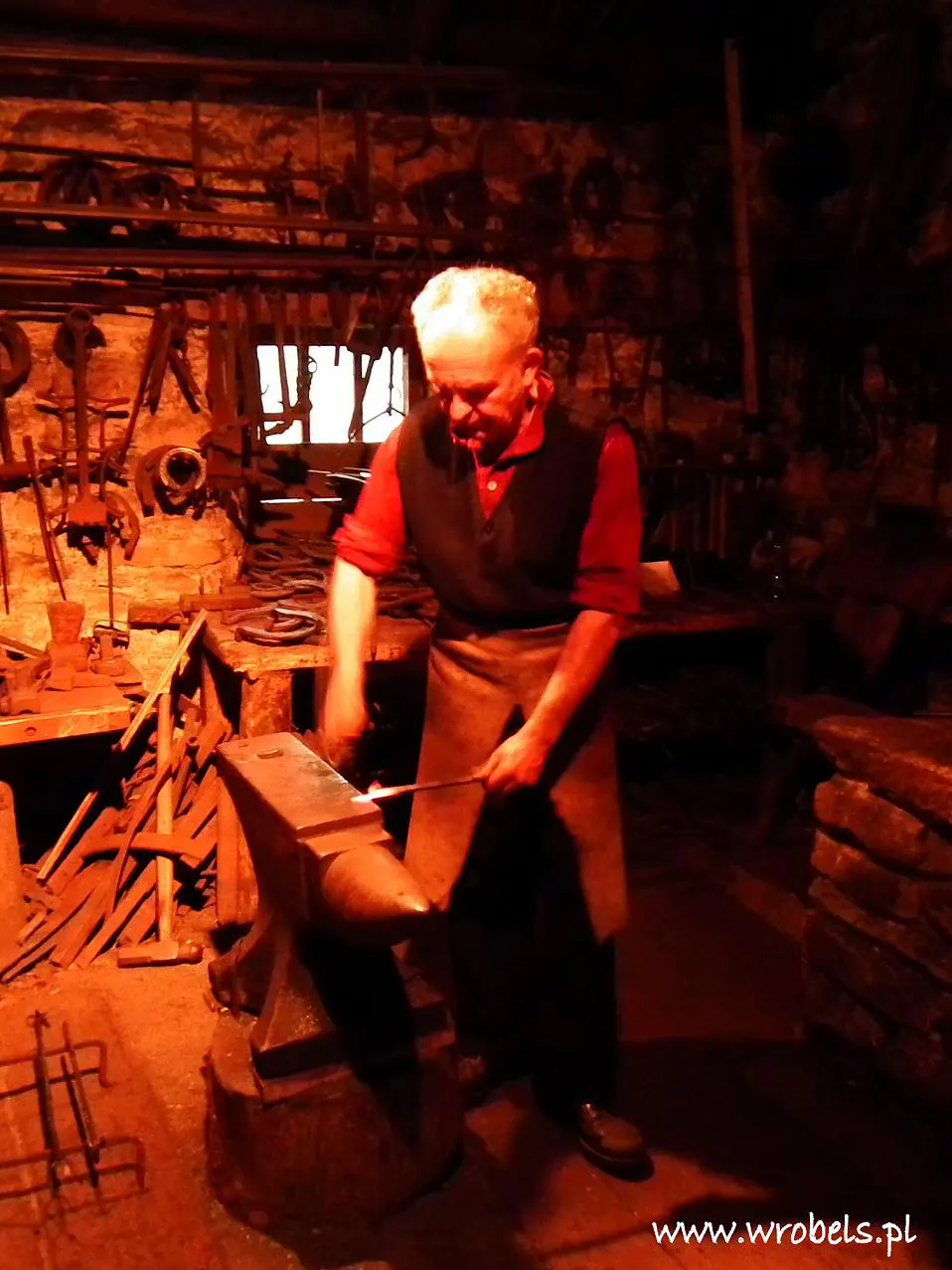 Główne palenisko znajdowało się pod ścianą szczytową, z dala od głównych drzwi, na ścianach porozwieszane były rozmaite, żelazne narzędzia, także na stołach porozstawianych dookoła widzieliśmy niezliczoną ilość przedmiotów. Zasłyszane stuki i puki wydobywały się z pod młota, którym zręcznie manewrował kowal. Kuźnia nie pozostała sama sobie, zadbano o to aby miejscowy kowal uchylił rąbka tajemnicy i zaprezentował wszystkim zwiedzającym kowalskie, jakże ważne w tamtych czasach, rzemiosło. Kowal był bardzo znaczącą postacią bo dbał nie tylko o konie ale również zajmował się wyrabianiem jak i naprawą sprzętu rolniczego.