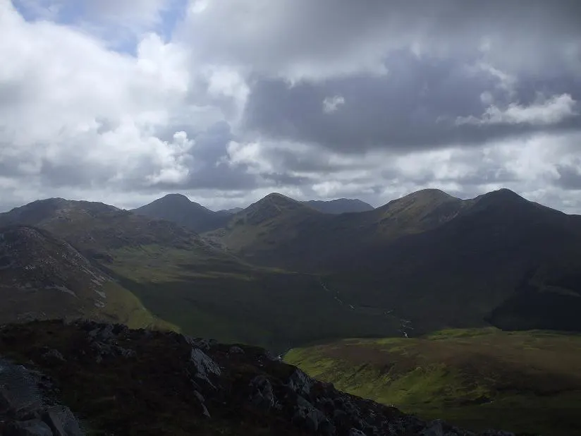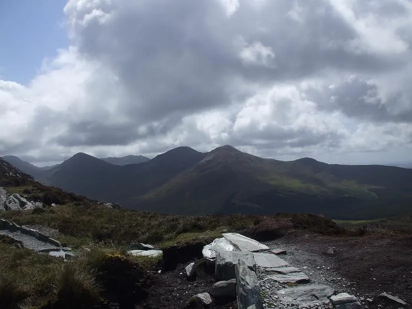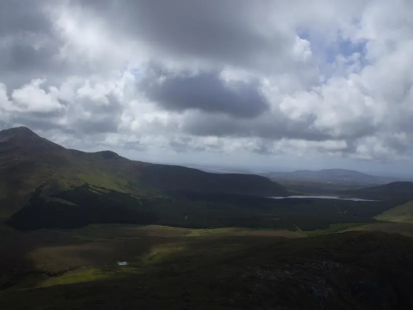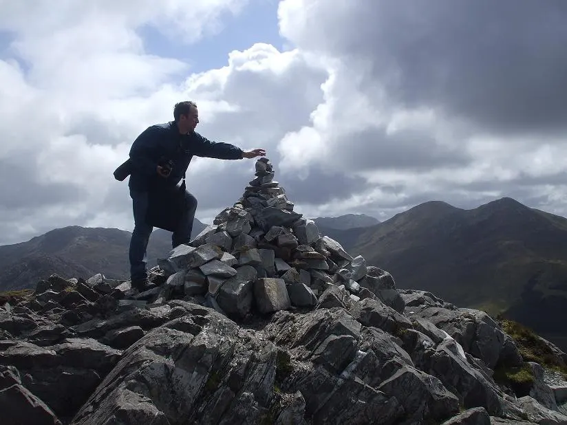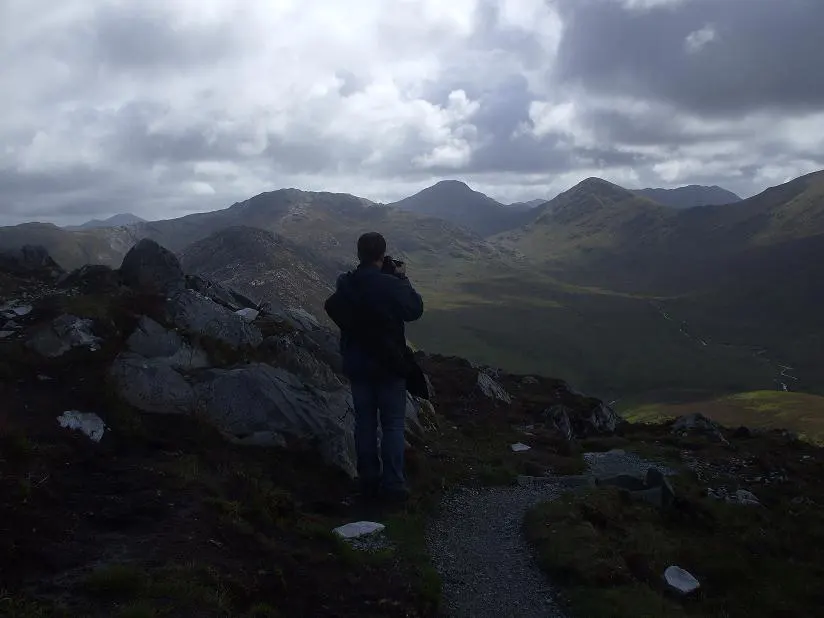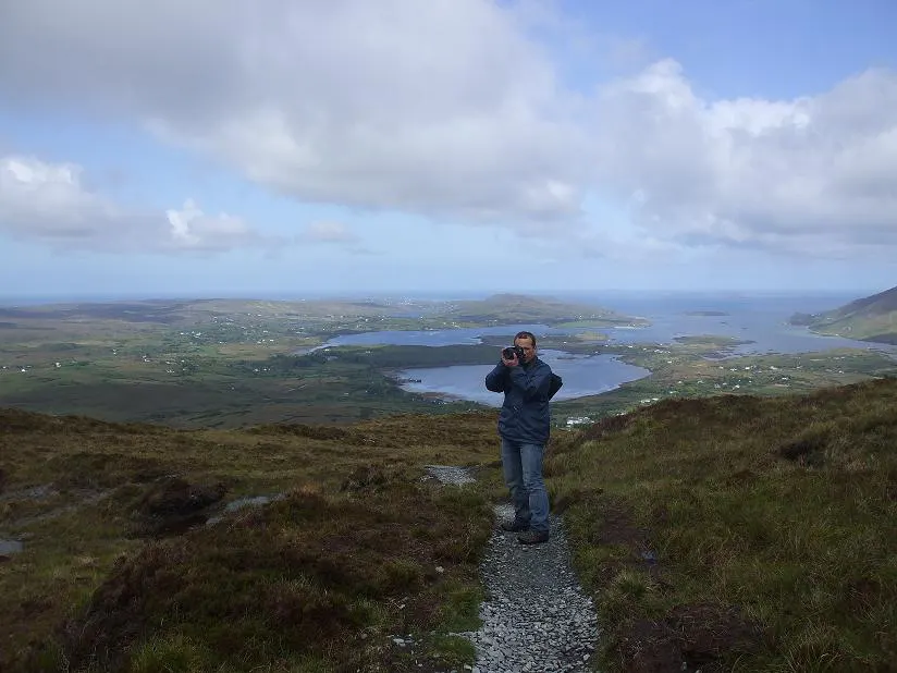 Podjęliśmy decyzję, że przejdziemy szlak w całości i będąc już setki metrów z przodu zaczęły się dziać rzeczy dla nas piękne, od rana z utęsknieniem oczekiwane. Pojawił się błękit nieba, promienie słoneczne przebijały się przez chmury, nie padało, a kolory wołały nas i zachęcały do uwieczniania dzikiej flory i fauny. Nie czekaliśmy na nic i zabraliśmy się za fotografię. Co paręnaście, parędziesiąt metrów postój, wyciąganie i ustawianie sprzętu i próba uchwycenia jak najlepszego momentu. Byliśmy szczęśliwi, rozentuzjazmowani i pełni energii. Ja się radowałem ale ważniejsza była radość Daniela, Park spełniał moje oczekiwania i budził Danielowi podziw oraz zadowolenie. Robiliśmy fotki, mój towarzysz podróży zdradzał rąbki tajemnicy z tej dziedziny i wspinaliśmy się na Benbaun. Widoki nas zabijały… Z jednej strony oceaniczna zatoka Ballynakill Bay i panorama Parku a z drugiej monumentalne i świetnie oświetlone szczyty masywu Tvelwe Pins. Wdrapaliśmy się na sam wierzchołek, dodaliśmy kolejne kamyczki na wcześniej usypany kopczyk, zrobiliśmy panoramy i zaczęliśmy schodzić w dół.
