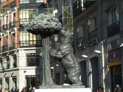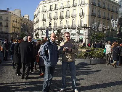 Mieszkaliśmy w Hostelu Numancia przy Calle Magdalena, do ścisłego centrum miasta mieliśmy zaledwie kilka minut drogi pieszo. PUERTA DEL SOL. Jest to centralny punkt miasta a zarazem serce całego kraju. Stąd mierzy się odległości, tutaj formalnie zaczyna się sześć hiszpańskich ‘’Rutas Nacionales ’’ (drogi znane jako N-1, N-2, N-3 itd.). W południowej części placu, przed wieżą zegarową znajduje się wmurowana w chodnik kamienna płyta z napisem: ‘’Kilometro Cero’’ (kilometr zerowy). Puerta del Sol, a zwłaszcza okolice fontanny i pomnika z herbem Madrytu (niedźwiedź wspinający się na ‘’madrono’’, czyli drzewo poziomkowe), na rogu c/Carmen, to ulubione miejsce spotkań mieszkańców i turystów. Puerta del Sol przywitała nas mnóstwem ludzi, było bardzo tłoczno. Zdążyliśmy zrobić parę fotek, miedzy innymi przy pomniku niedźwiedzia, odwiedziliśmy oficjalny sklep Realu Madryt i ruszyliśmy na północ w kierunku…